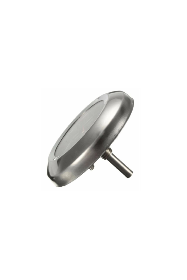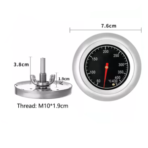 It is stainless steel and very easy to install, just insert the stem through the hole on your pit/smoker/grill and then attach the nut.