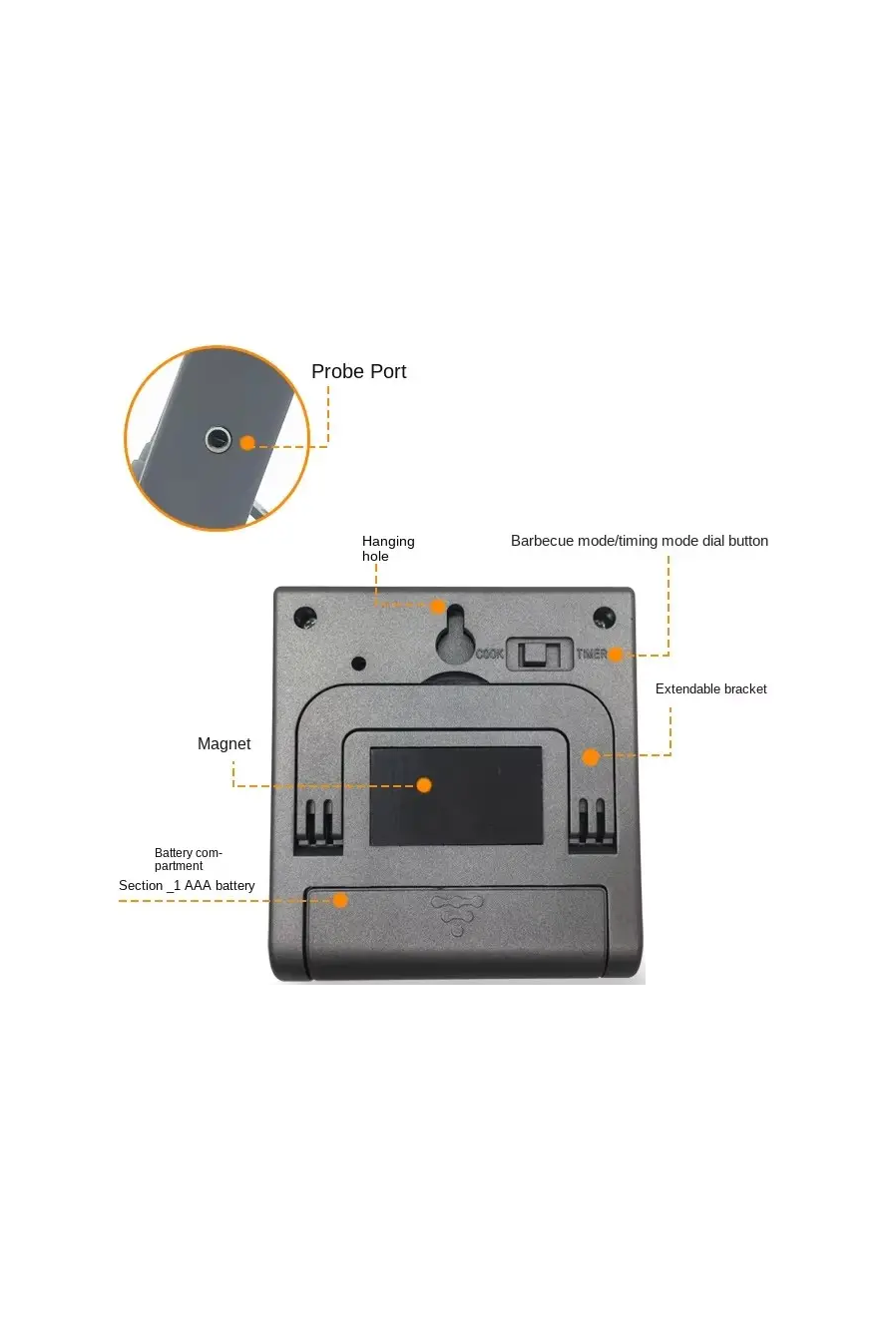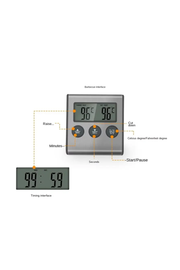 LCD Screen: Displays meat temperature and set temperature while in cook mode. Displays countdown when in timer mode.(No battery)