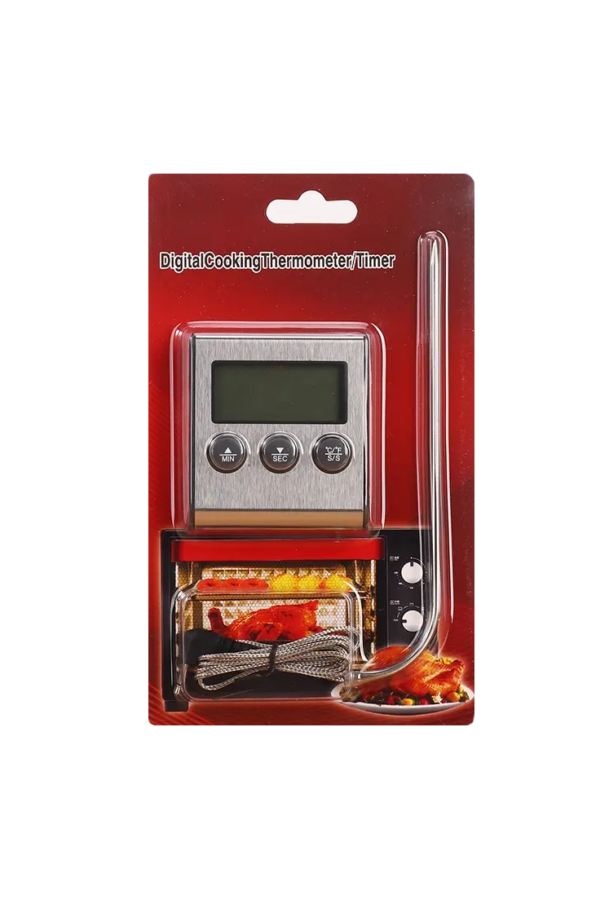 The measurement range is from 0°C to 250°C (32~482°F), and the temperature unit is switchable in °C/°F. Cook & Timer mode is switchable to easily set alarm temperature and countdown time as needed. The LCD screen displays the temperature at a glance. When the temperature reaches the preset alarm value, the thermometer will alarm. Long wires provide enough space to keep a safe distance from heat sources. The rear is designed with brackets, hanging holes and magnets for wall mount or desktop stand. Perfect for indoor and outdoor cooking, grilling, and measuring the temperature of steak, turkey, milk, and more. Specification: Material: ABS+SS304 Temperature measurement: 0~250°C / 32~482°F Temperature Accuracy: ±1°C/°F(0~100°C), ±1.5°C/°F(101~250°C) Temperature Display Resolution: 0.1°C / 0.2°F Timer range: 99MIN, 59SEC Power: 1 * 1.5V AAA battery (not included) Item size: 70*65*16mm The size of this product is measured by hand, there may be slight gaps packing list: 1 * Food Thermometer 1 * Probe